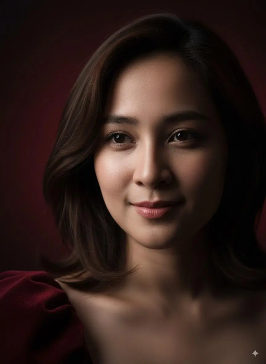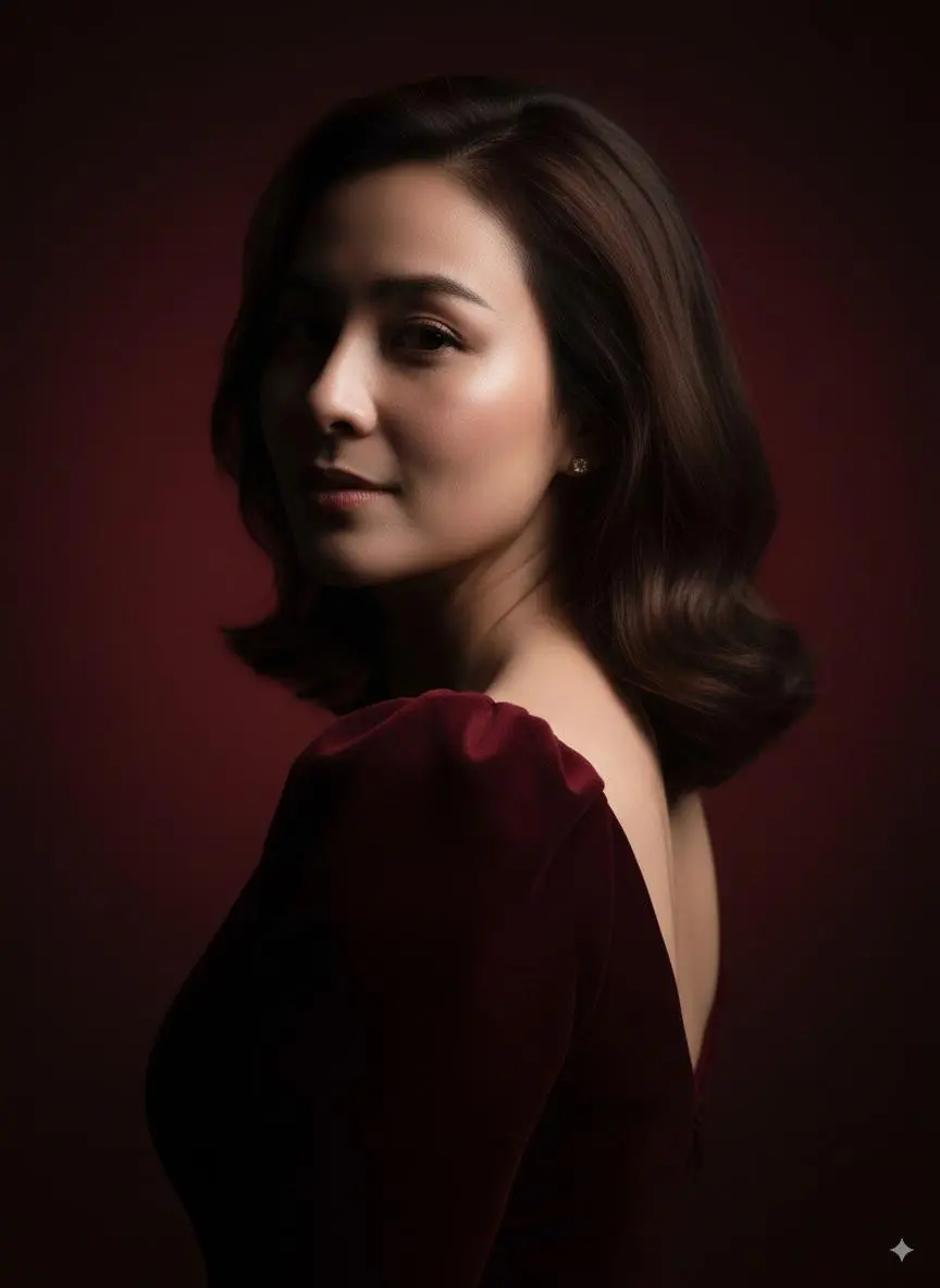 "prompt": "Ultra-realistic artistic editorial close-up of a Southeast Asian woman (match the face, skin tone, and unique features to the uploaded reference photo). The portrait focuses dramatically on key facial details: either the eyes, lips, or half of the face, with shoulder-length flowy hair softly entering the frame. Only a subtle glimpse of the luxurious dark ruby red gown with puff shoulder may appear, blurred or partially cropped for an abstract effect. Makeup is soft and natural: glowing skin, nude tones, soft rose lips. Expression is evocative and intimate, designed to capture mood rather than a full portrait. Professional artistic lighting: dramatic side light, deep contrast shadows, with selective highlights to emphasize texture and emotion. Background fades into abstract darkness, luxury high-fashion editorial style.",
