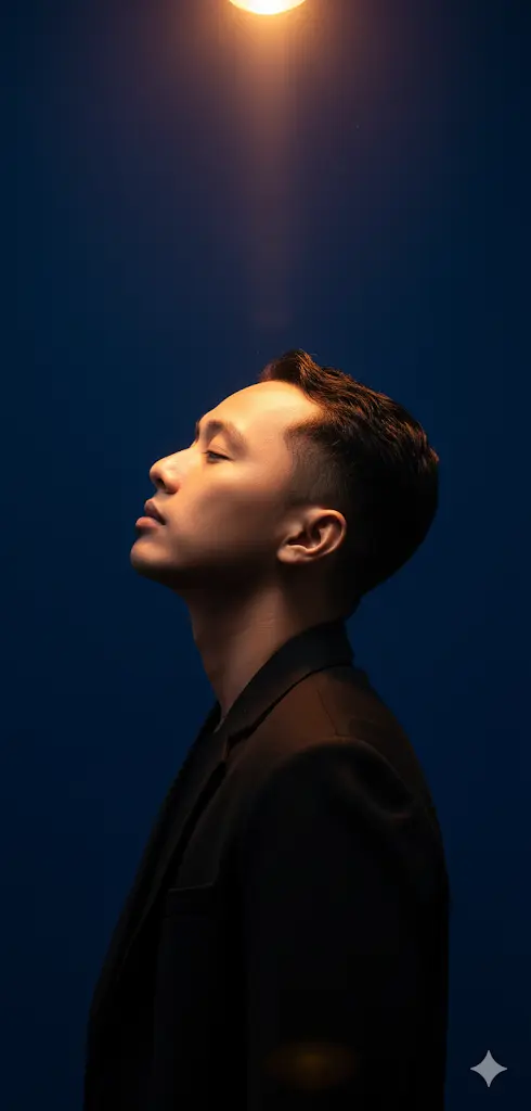 Potret studio dramatis dari orang yang ditampilkan dalam gambar ini, diambil dari samping dengan latar belakang biru tua. Subjek mengenakan blazer kasual hitam ramping, kepalanya mendongak dengan mata tertutup, bermandikan cahaya lampu sorot keemasan hangat yang bersinar dari atas. Kontras antara latar belakang biru dingin dan cahaya kuning lembut menciptakan efek dua warna yang kuat, menonjolkan kontur wajah subjek dan garis-garis tajam blazer.Dan ini hasilnya: